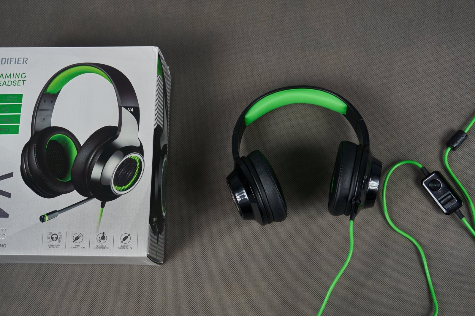 Mam bardzo mieszane uczucia odnośnie designu Edifier V4 – z jednej strony coś w środku mnie krzyczy, że całość byłaby dużo lepsza w całkowitej czerni, a z drugiej strony osoba decydująca się na ten model na pewno jest świadoma tego podświetlenia i być może poszukuje czegoś z właśnie takim, krzyczącym designem? Od razu do głowy przychodzą mi zamierzchłe czasy, kiedy słuchawki gamingowe SteelSeries Siberia v2 Frost Blue z podobnym, aczkolwiek „oddychającym” podświetleniem, były traktowane jako edycja limitowana i, o ile mnie pamięć nie myli, były droższe niż wersja standardowa. Po długim namyśle jednak stwierdzam, że trudno krytykować gamingowe słuchawki za gamingowy wygląd – myślę, że niejeden fan LED-ów i RGB z miłą chęcią dołączyłby do swojego zestawu podświetlane słuchawki. A zieleń podobno uspokaja, prawda?