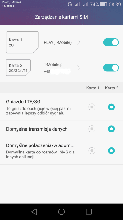 - dual SIM: niestety, wbrew zapowiedziom Honor Polska na konferencji wprowadzającej produkt na rynek, dual SIM nie jest aktywny, a standby; w ustawieniach wybieramy, która karta ma obsługiwać transmisję danych – jedna działa na 2G/3G/LTE (nie da się ustawić sztywno tylko na LTE), druga – na 2G; do każdej karty możemy oczywiście przypisać inny dźwięk dzwonka,