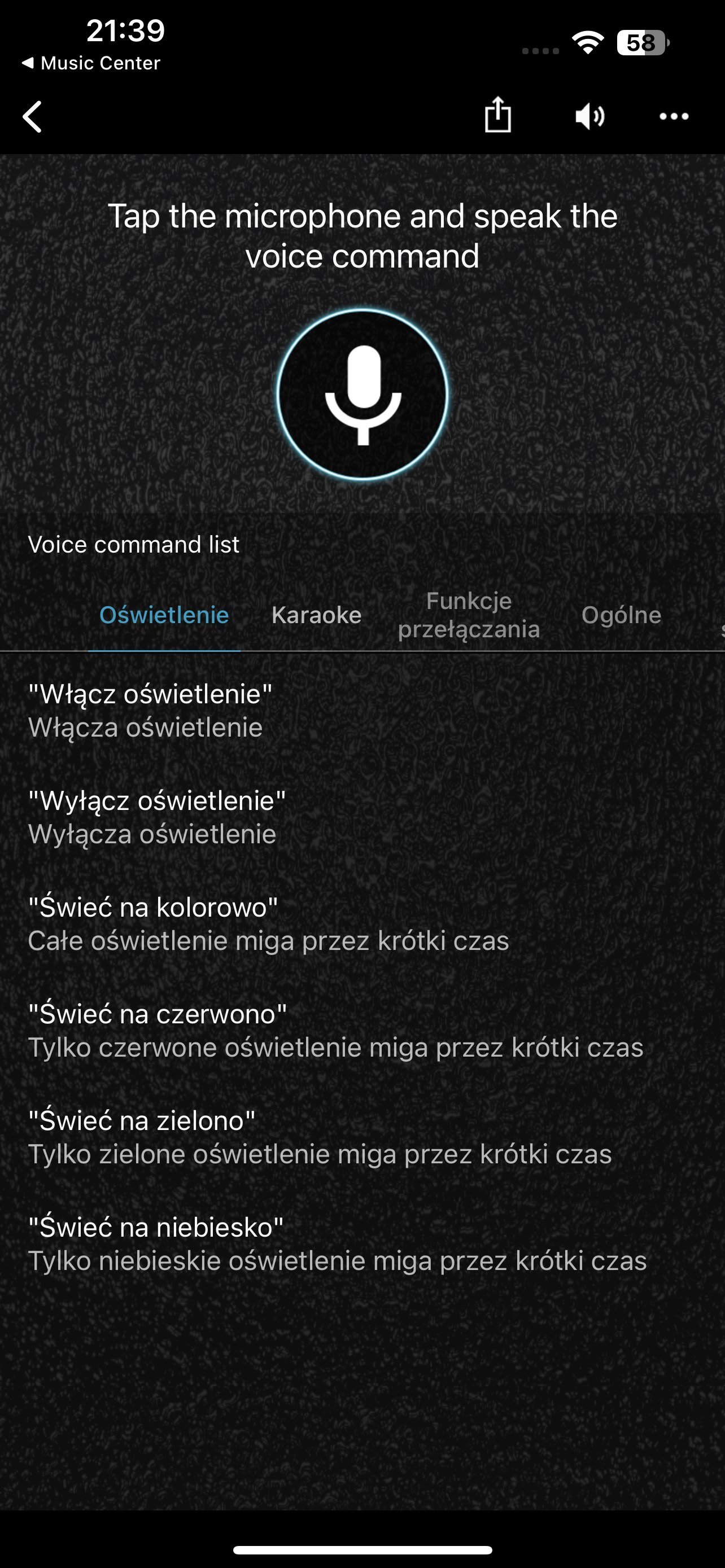 Zacznijmy od omówienia tej najważniejszej apki, czyli Music Center. Wszystkie istotne przełączniki do zmiany ustawień naszego głośnika ulokowano bezpośrednio na ekranie głównym, co znacząco ułatwia nawigowanie po interfejsie.