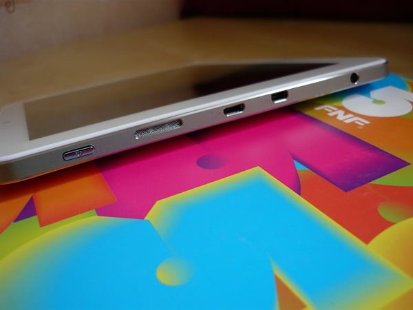 Trzymając tablet w pozycji poziomej, na lewym boku znajdziemy porty, złącza, głośnik skryty pod srebrną maskownicą, z którego wydobywa się niezbyt głośny, ale czysty dźwięk, oraz posrebrzany przycisk Power, służący również do usypiania i wybudzania urządzenia. Na górnym obrzeżu, po lewej stronie, znajdziemy przycisk Menu oraz klawisz do regulacji głośności, zaś na dole ulokowany został slot kart microSD, złącze kart SIM skryte pod zaślepką oraz mikrofon. Prawy bok został niezagospodarowany, na próżno doszukiwać się w ifive MX przycisku reset. Na szczęście podczas testów i tak nie zostałby wykorzystany.