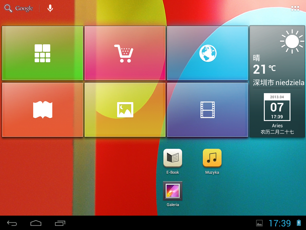 Firma FNF wzbogaciła system o nakładkę graficzną na interfejs w postaci kafelków, co możecie zobaczyć na poniższych screenach. Dzięki temu otrzymujemy szybki dostęp do menu (zdublowane), marketu z aplikacjami FNF, przeglądarki internetowej, preinstalowanego czytnika e-booków, galerii obrazów, wideoteki oraz do aplikacji iFive Weather, która prezentuje informacje wyłącznie w języku chińskim. Można zmienić kolejność kafelków, jednak nie ma możliwości ich usunięcia, przez co tak naprawdę do zagospodarowania pozostają cztery pulpity. Sam system działa szybko i sprawnie. Stockowa przeglądarka internetowa podczas testów ani razu nie wymusiła zamknięcia, a system się nie zawieszał.