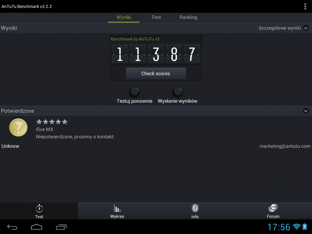 Konfiguracja sprzętowa zapewnia nie tylko sprawną pracę systemu, ale również możliwość uruchomienia prawie wszystkich tytułów dostępnych na chwilę obecną w sklepie z aplikacjami Google Play. Bez żadnych problemów ifive MX poradził sobie z chociażby Asphalt 7: Heat, Wild Blood, Need For Speed Most Wanted, a także Real Racing 3. Poniżej znajdziecie wyniki uzyskane przez tablet w poszczególnych aplikacjach benchmarkowych.