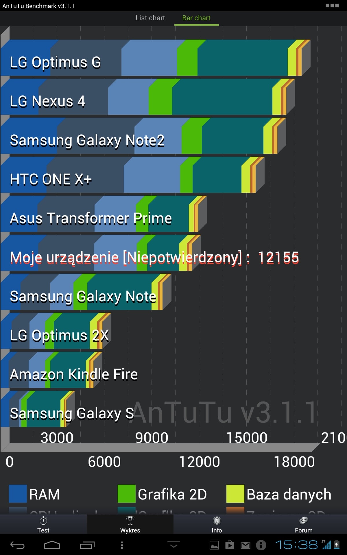 AnTuTu: 12155 (CPU: 6239, GPU: 2685, RAM: 2379, I/O: 852)
