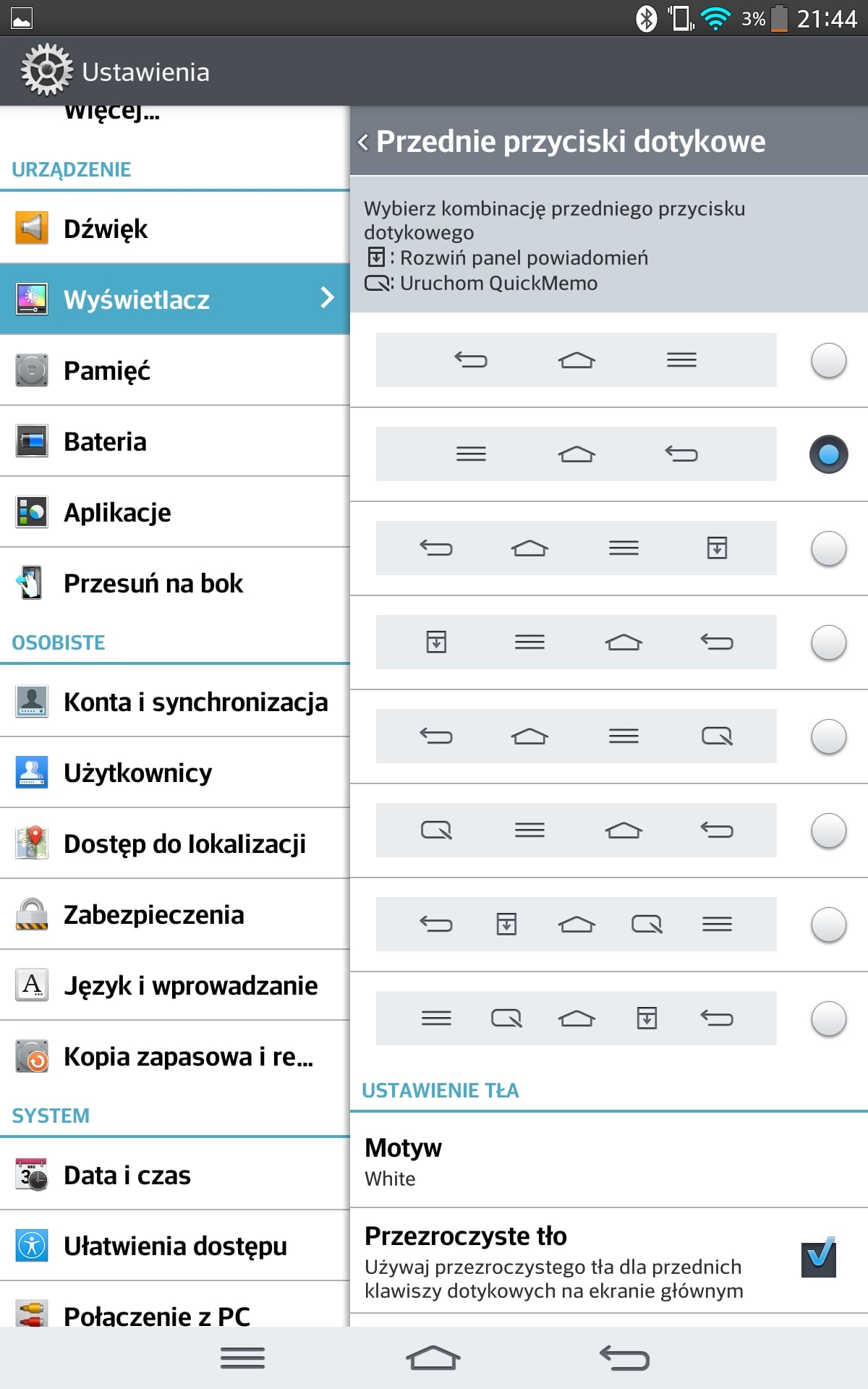Co ważne, w ustawieniach mamy możliwość zmiany kolejności przycisków pod ekranem, dzięki czemu niekoniecznie musimy korzystać z domyślnego ustawienia, od lewej: ustawienia, home i wstecz. Dodatkowo możemy dodać dwie ikony: rozwijanie panelu powiadomień i QuickMemo. Niestety, nie spotkałam się z możliwością schowania tej belki, przez co między innymi w niektórych grach (bo też nie we wszystkich) jest ona cały czas widoczna na ekranie.
