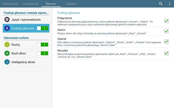 Sterowanie ruchem to coś, obok czego trudno przejść obojętnie w sprzęcie Samsunga. Dzięki tym funkcjom korzystanie z tabletu staje się jeszcze prostsze. Możemy sterować tabletem zarówno za pomocą ruchów samego urządzenia (jak np. przybliżanie/oddalanie ekranu w galerii), jak również ruchami dłonią (przechwytywanie ekranu przez przesunięcie bokiem ręki od jednej krawędzi do drugiej lub wstrzymanie dźwięków przykrywając ekran ręką). A wszystko to dopełniają funkcje głosowe i inteligentny ekran.