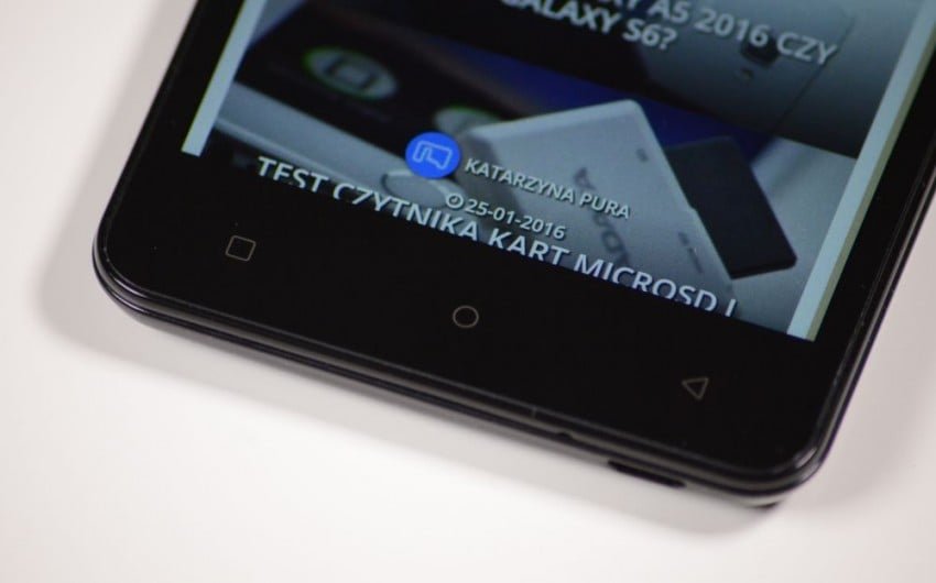 Patrząc na telefon z przodu, naszym oczom od razu rzucają się szerokie ramki przy prawej i lewej krawędzi i jeszcze szersze nad i pod ekranem. Pod ekranem znajdziemy niepodświetlane przyciski systemowe (otwarte aplikacje, home i wstecz), natomiast nad nim – kamerkę do połączeń wideo i selfie, głośnik oraz czujnik natężenia światła. Zabrakło diody powiadomień.