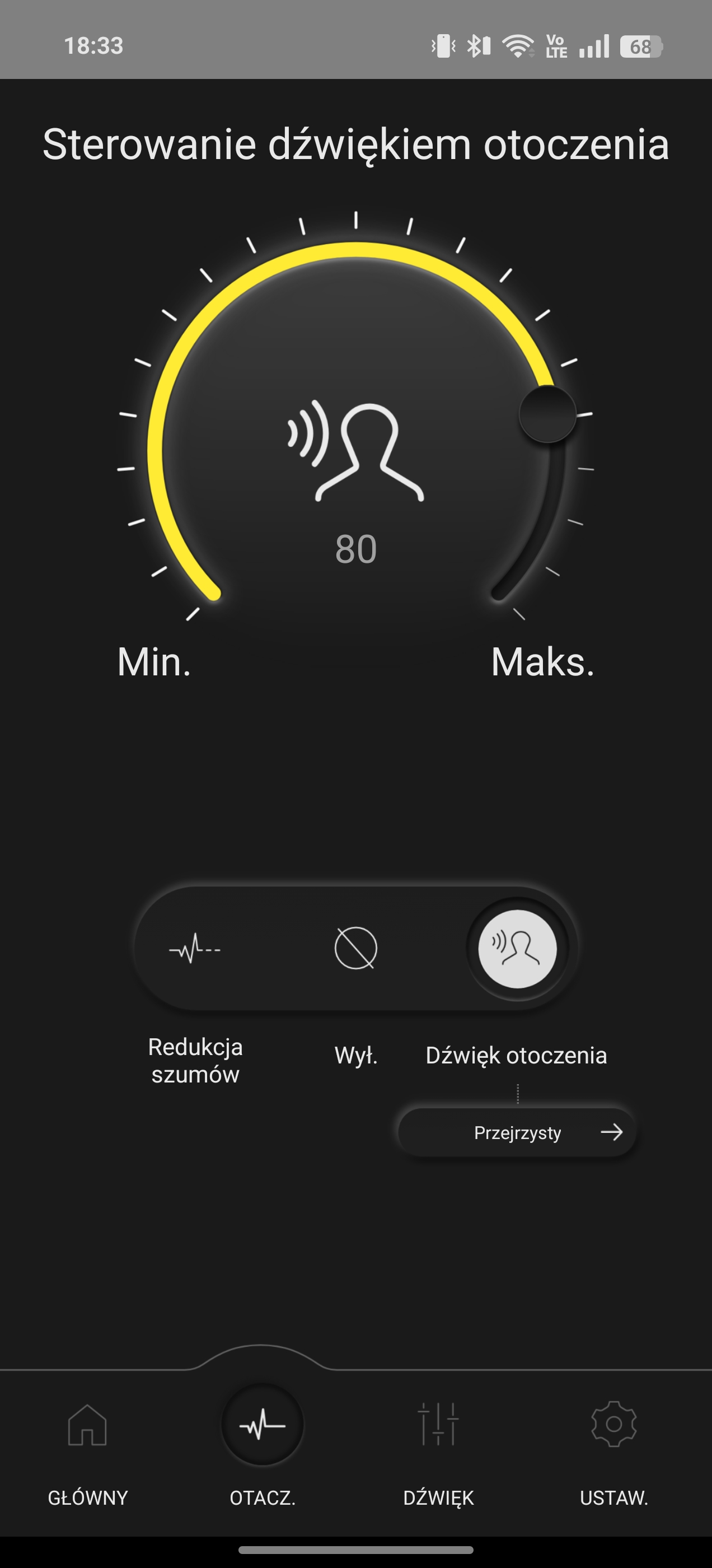 Gdy przełączymy się na tryb uwagi, całe otoczenie, istotnie, sprawia wrażenie nieco przytłumionego (np. odgłosy przejeżdżających aut), wypychając bardziej na pierwszy plan ewentualne głosy. Te jednak – w zależności od poziomu hałasu w tle – nie zawsze brzmią aż tak wyraźnie, przez co osobiście wolałem korzystać z predefiniowanego, całkowocie przepuszczalnego trybu ambient.
