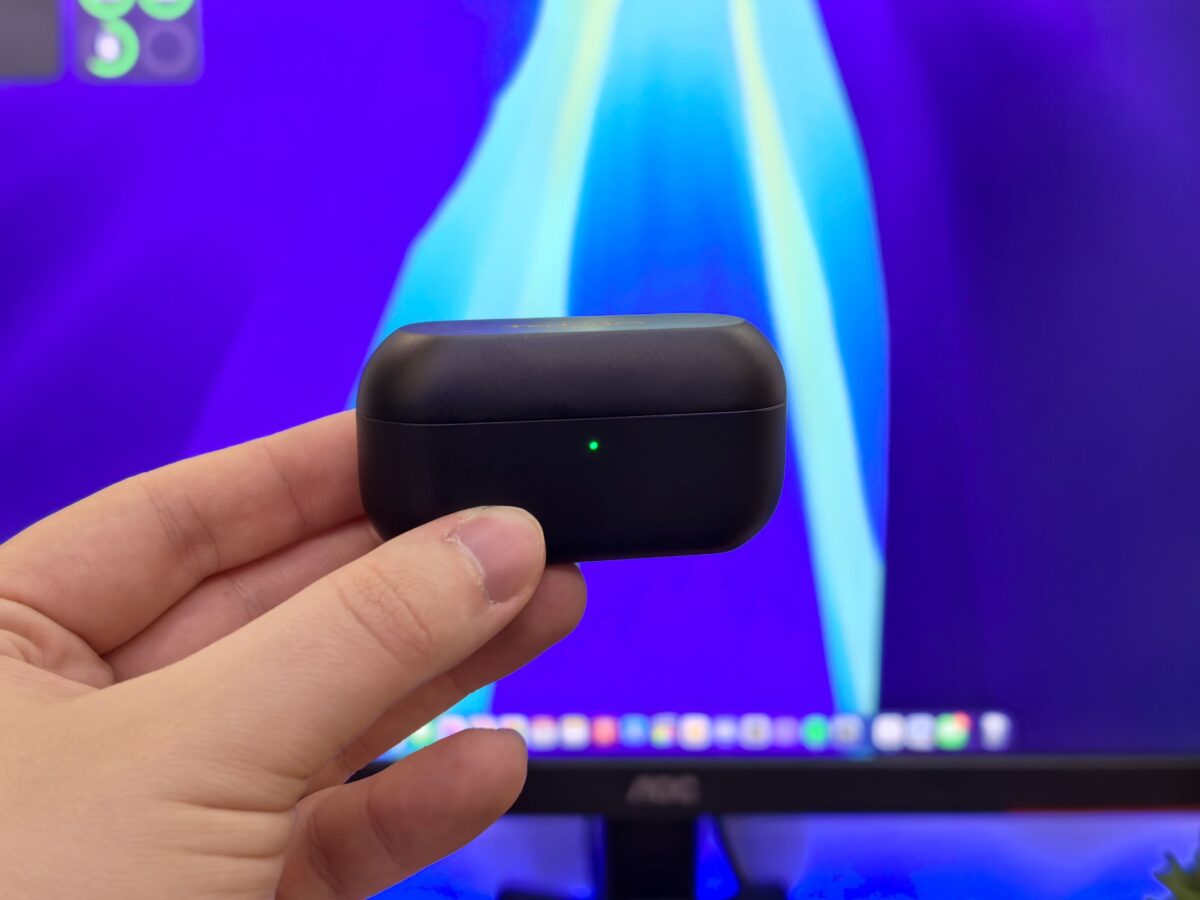 Pozostała, dolna część etui, to już tworzywo sztuczne (między innymi dlatego, by działało ładowanie indukcyjne), jednakże jest ono na tyle solidne i tak dobrze wykończone, że niemalże nie odstaje jakościowo od tej metalowej klapki. W zasadzie jedynym, po czym można rozpoznać różnicę w materiałach, jest fakt, że górna część – jak na metal przystało – pozostaje bardziej zimna. Na froncie ulokowano diodę LED informującą o stanie naładowania, natomiast z tyłu złącze USB-C.