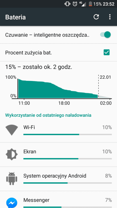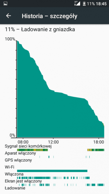 Korzystając z Shine Lite wyłącznie na danych mobilnych i z jasnością automatyczną, uzyskanie pełnego dnia działania graniczy z cudem. Czas na włączonym ekranie wynosi wtedy średnio 3,5 godziny. Gdy do tego dołożymy GPS, a jasność ekranu zmienimy na maksymalną – czas skraca się do 2-2,5 godziny. Jak sytuacja wygląda używając Shine Lite z włączonym WiFi? Też wcale nie idealnie – niepełne dwa dni, z czego 2,5-3 godziny na włączonym ekranie to maks, jaki udało mi się uzyskać.