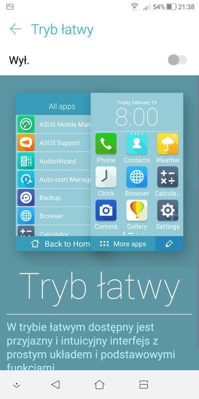 • tryb łatwy: przyjazny, intuicyjny interfejs z prostym układem i podstawowymi funkcjami,