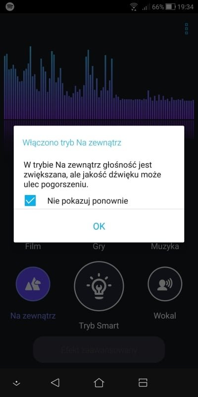 Zenfone Max Plus jest kolejnym smartfonem, którego dwie maskownice, umieszczone na dolnej krawędzi, mogą wprowadzać w błąd – nie mamy tu bowiem głośników stereo, jak może się wydawać w pierwszej chwili, a jedynie jeden głośnik mono (dźwięk wydobywa się wyłącznie z prawej maskownicy; po drugiej stronie microUSB jest mikrofon). Niestety, o samej jakości dźwięku nie można powiedzieć zbyt wiele pozytywnych słów. Przede wszystkim jest relatywnie cichy – przestawienie go w tryb „Na zewnątrz” bardzo pogarsza jakość dźwięku, przez co nie polecam tego robić. Dźwięk, w zależności od włączonego trybu (film, gry, muzyka, wokal, na zewnątrz lub Smart; jest też equalizer) ma różną charakterystykę, ale w każdym z nich, niestety, jest dość spłaszczony, przez co raczej nie może być mowy o przyjemności płynącej ze słuchania muzyki na głośniku (co ciekawe, mi najbardziej do gustu przypadł, nawet podczas słuchania playlist ze Spotify, tryb gry, który sprawia, że dźwięk staje się nieco bardziej przestrzenny i głębszy).