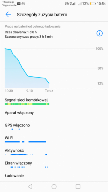 Dzień lub dwa dni działania, z czego na włączonym ekranie (SoT) 4,5 – 5,5 godziny. I niby to jest niezły czas, ale patrząc na pojemność akumulatora można mieć apetyt na więcej. Raz na screenach widoczne jest nieco ponad 3 godziny SoT, ale ma to swoje uzasadnienie – przez dość długi czas smartfon służył jako router, co zresztą sygnalizuje odpowiednia ikona na górnym pasku.