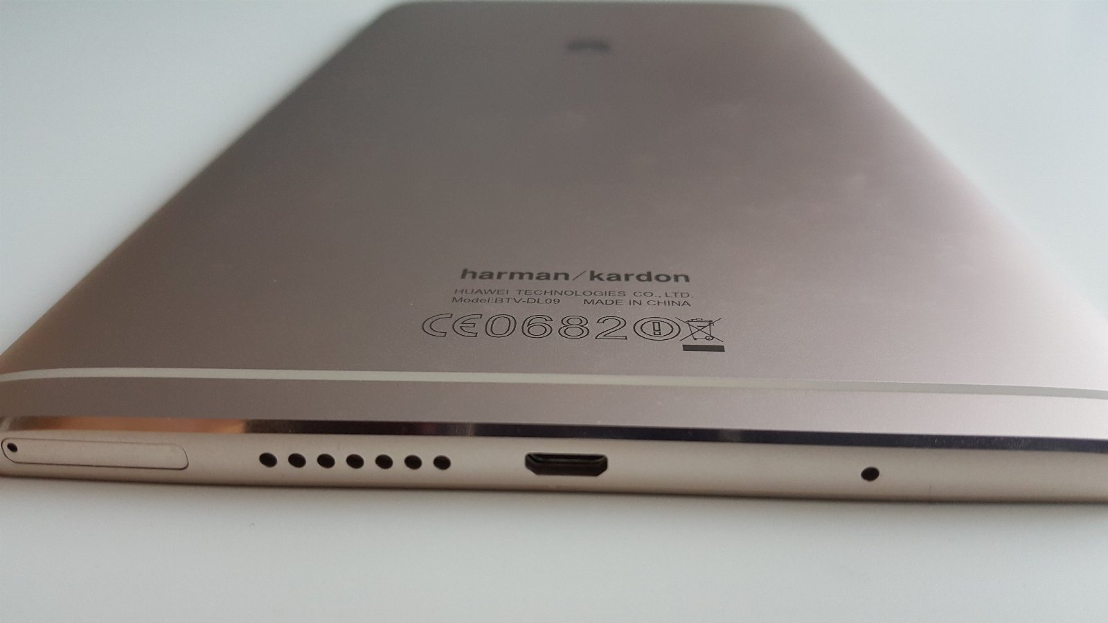 Front tabletu zajmuje w większości 8,4-calowy ekran, pod którym jest wcześniej wspomniany fizyczny przycisk z czytnikiem. Powyżej wyświetlacza znajdują się natomiast: logo producenta, dioda powiadomień oraz kamerka 8 Mpix. Z tyłu mamy jedynie „oczko” aparatu 8 Mpix, napisy Huawei oraz Harman Kardon. Głośniki stereo znalazły się na dolnej i górnej krawędzi tabletu. Nie zabrakło również mikrofonów, szufladki na karty nano SIM i microSD do 128GB złącza microUSB 2.0 oraz audio jack 3,5 mm.
