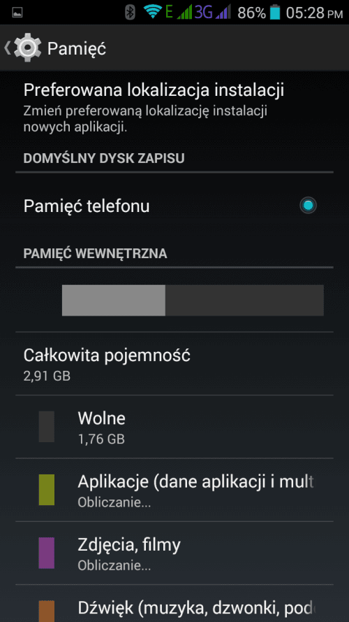 Z 16GB pamięci wewnętrznej mamy do wykorzystania niecałe 13GB, przy czym pamięć została dość dziwnie podzielona na pamięć wewnętrzną, która wynosi 2,91GB i pamięć telefonu – 10,03GB (po podłączeniu do komputera widoczna jest tylko ta druga). Pamięć można rozszerzyć dzięki slotowi kart microSD, ale tylko do 64GB (kart 128GB nie obsługuje). Nie ma możliwości przenoszenia aplikacji i gier na kartę pamięci, ale jest za to opcja instalowania bezpośrednio na niej.