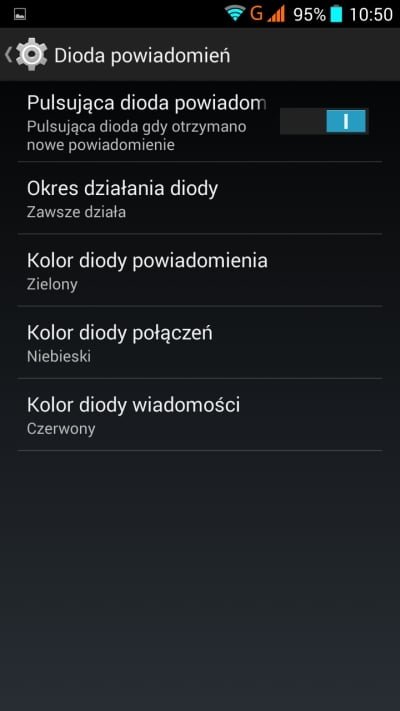 W ustawieniach możemy włączyć lub wyłączyć diodę powiadomień i, co istotne, ustawić okres jej działania od momentu pojawienia się powiadomienia (5, 15,30 minut, 1-2 godziny i zawsze). Żeby było jeszcze ciekawiej, to my decydujemy, jaki kolor będzie miało migające światełko dla trzech różnych powiadomień: połączeń, wiadomości i pozostałych. Do wyboru: czerwony, zielony, niebieski, żółty, błękitny, biały i fioletowy. Możemy również dodatkowo włączyć powiadomienia diodą doświetlającą (tą od aparatu – screen po lewej).