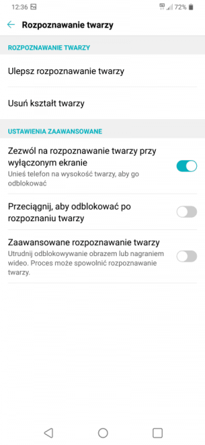Rozpoznawanie twarzy to druga z metod zabezpieczenia biometrycznego, spośród dostępnych w testowanym smartfonie. Nie jestem jednak zwolenniczką tego rozwiązania – ani w LG, ani w urządzeniach konkurencji. W G7 ThinQ działanie rozpoznawania twarzy nie pozostawia wiele do życzenia w dobrych warunkach oświetleniowych (pod warunkiem, że patrzymy na telefon na wprost, pod kątem często “nie chwyta”), schody zaczynają się, gdy światła brakuje lub założymy okulary przeciwsłoneczne. Z okularami korekcyjnymi radzi sobie w porządku.