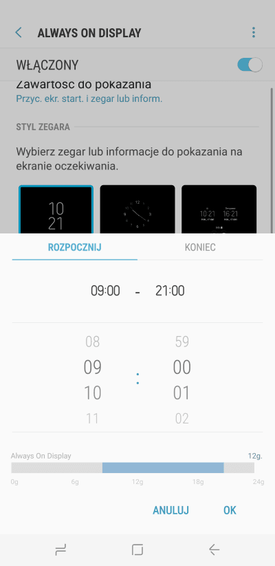 Wartym odnotowania jest jeszcze Always on Display, czyli system powiadomień na wygaszonym ekranie, znany zresztą z poprzedniej generacji flagowców Samsunga. Jak sama nazwa wskazuje, na ekranie cały czas wyświetlane są podstawowe informacje; w wersji podstawowej – godzina, data, procent naładowania baterii oraz ikony aplikacji, z jakich oczekują na nas powiadomienia. AoD można spersonalizować w ustawieniach – zmieniać zawartość ekranu, styl zegara, ustawić kalendarz lub obraz, a także włączyć zegar przy krawędzi. Na drugim ekranie może być też kontroler muzyki, plan na dziś i informacja o następnym alarmie. Co ciekawe, motywy używane w Always on Display można pobrać lub nawet kupić w sklepie Samsunga.