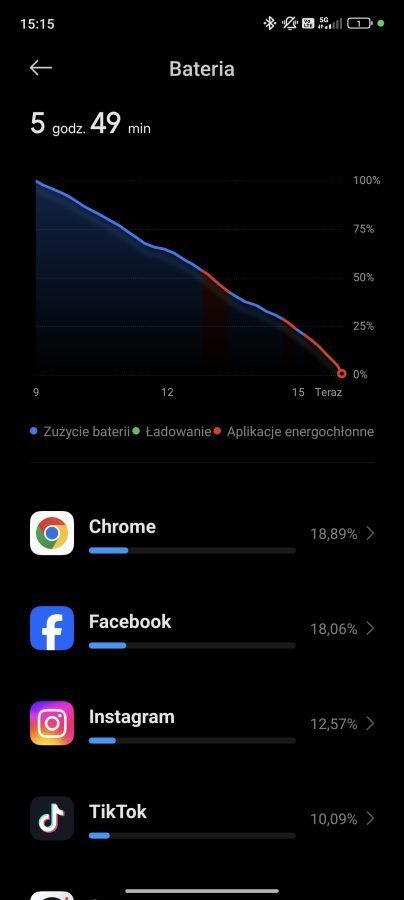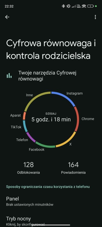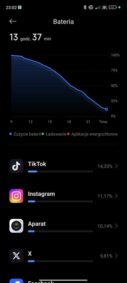 Niestety – konkretnych danych na temat SoT, czyli czasu na włączonym ekranie, nie jestem w stanie podać, bo Xiaomi, z niewiadomych powodów, w kolejnych smartfonach ogranicza wyświetlanie tego ważnego dla nas szczegółu z poziomu zużycia energii w ciągu dnia. Co gorsza, przez praktycznie cały czas trwania testów nie działała mi też funkcja Równowaga cyfrowa, która mogłaby pomóc oszacować SoT.