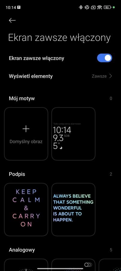 Always on Display (Ekran zawsze włączony) standardowo ukryty został w zakładce ustawień Tapeta i personalizacja, bo przecież nie może być logicznie – w wyświetlaczu czy ekranie blokady. AoD może działać przez 10 sekund po dotknięciu, zawsze, w zaplanowanych godzinach lub inteligentnie (nie wyświetla się np. mając telefon w kieszeni czy torebce).