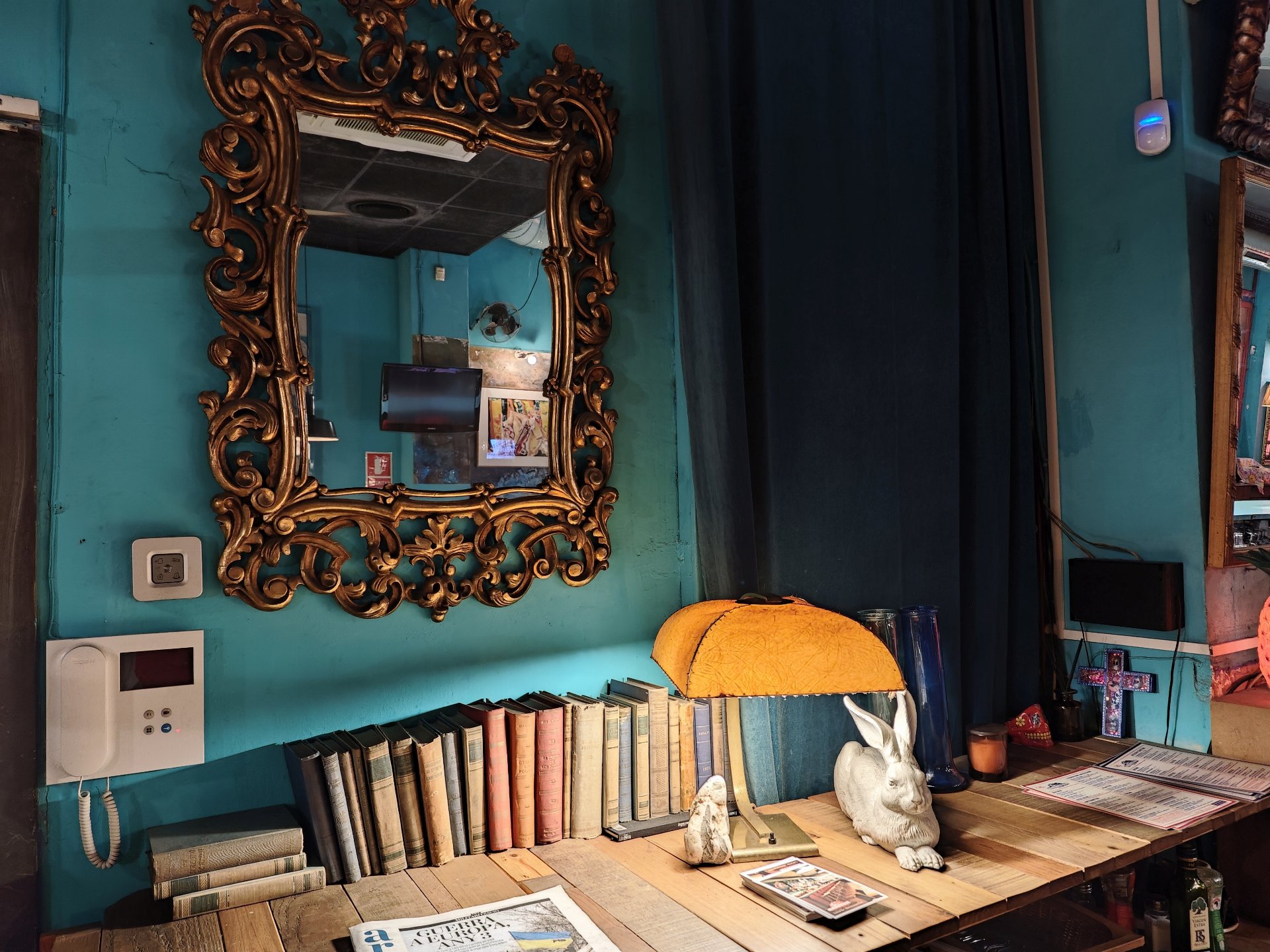 Zdjęcia po zmroku wypadają ogólnie dobrze, ale jest kilka rzeczy, na które warto zwrócić uwagę. Przede wszystkim aparat ma tendencję do prześwietlania jaśniejszych części kadru i degradowania szczegółów, gdy pozostała część jest ciemniejsza – zwróćcie uwagę na książki w knajpie (te tuż pod lampką i obok niej mają nieczytelne napisy) czy kolumnę i stojącą obok gabloty za kanapą na innym zdjęciu. Z pomocą przychodzi wtedy tryb nocny, który potrafi dodać nieco więcej informacji tam, gdzie ich brakuje w trybie automatycznym.