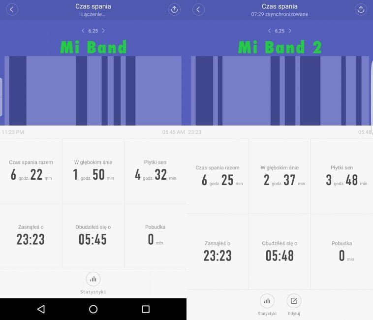 Mi Band 2 wydaje się być również i tutaj mniej wyczulony na jakikolwiek ruch, niżeli jego poprzednik. Można to zauważyć po długości faz „głębokiego snu”, gdzie najnowsza wersja odnotowuje o wiele dłuższe jej przebiegi. Jak jest naprawdę i czy te pomiary poszczególnych etapów są wiarygodne – tego nie jestem w stanie sprawdzić. Prawdą jest natomiast, że czas zaśnięcia i przebudzenia jest bardzo zbliżony do rzeczywistych.