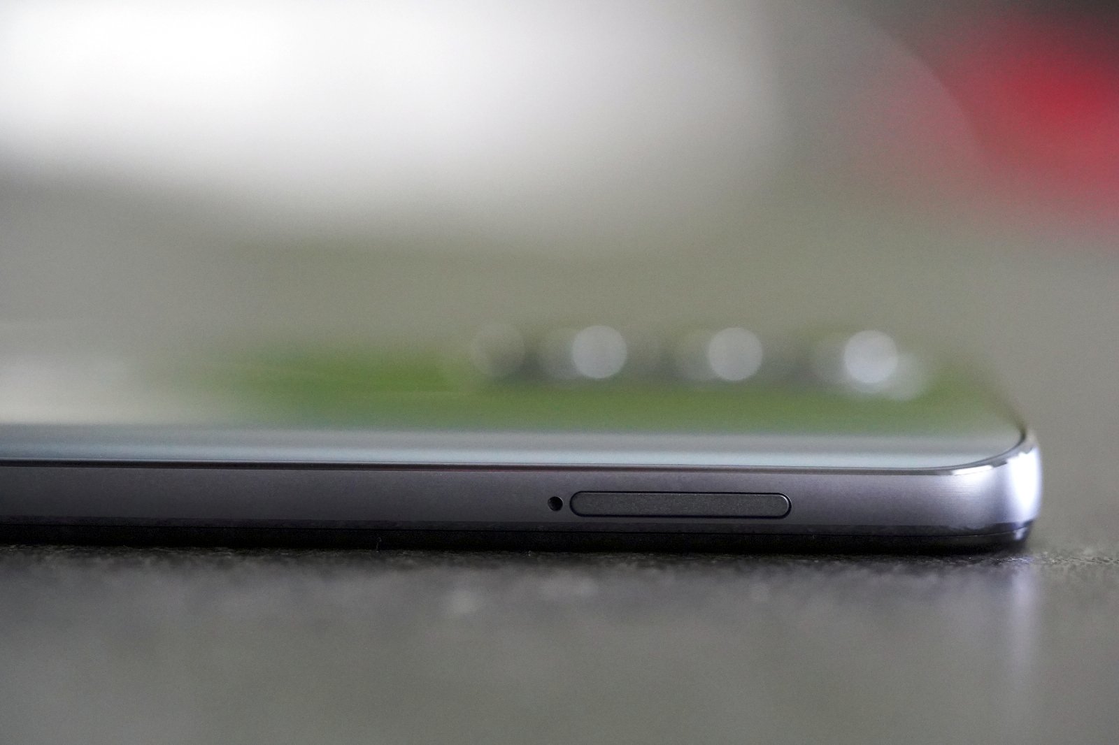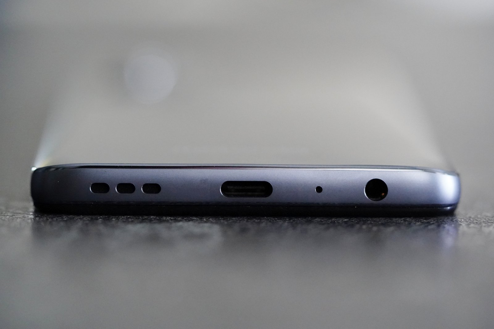 Patrząc od przodu, z prawej strony znajdziemy guziki od głośności oraz przycisk zasilania ze zintegrowanym czytnikiem linii papilarnych. U dołu jest gniazdo ładowania, coraz rzadszy 3,5 mm jack audio oraz kratkę dedykowaną głośnikom.