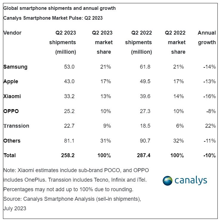 Producenci nieustannie walczą o to, aby klienci kupili właśnie ich urządzenie. Ich wysiłki przynoszą jednak umiarkowanie satysfakcjonujący skutek, ponieważ według danych, udostępnionych dziś przez Canalys, w drugim kwartale 2023 roku dostarczono na rynek o 10% mniej smartfonów niż w analogicznym okresie rok wcześniej – 258,2 mln vs 287,4 mln w Q2 2022.