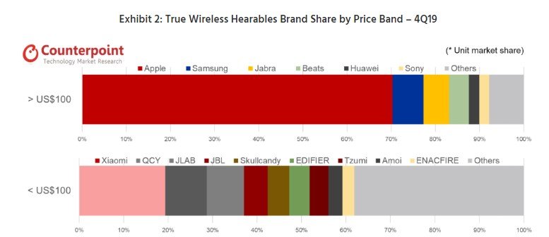 Zanim jednak prognozowane wyniki na 2020 rok, przyjrzyjmy się temu, co działo się w czwartym kwartale 2019 roku. Szacuje się, że na całym świecie sprzedano wówczas 51 milionów par słuchawek bezprzewodowych o łącznej wartości 6,6 miliarda dolarów.