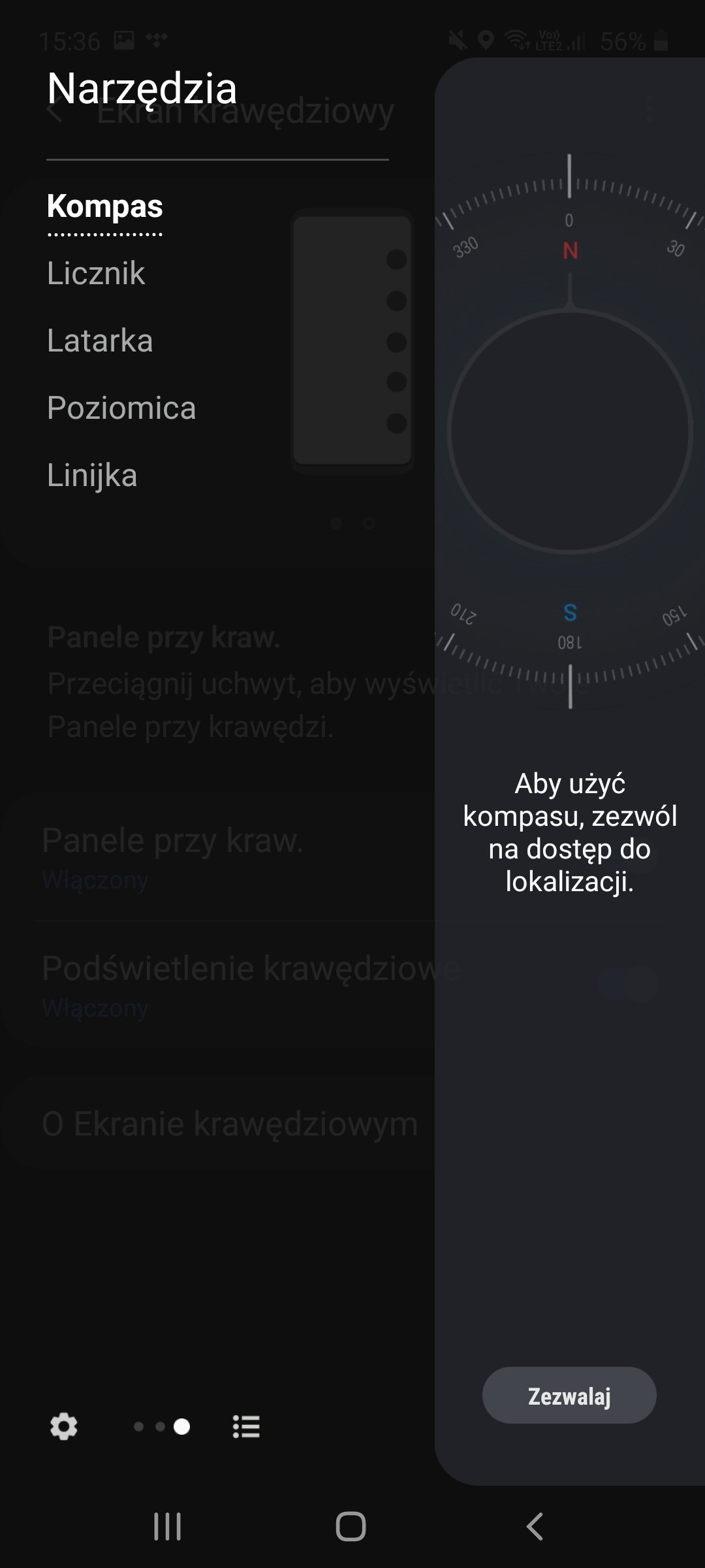 - ekran krawędziowy wysuwany z lewej lub prawej krawędzi. Umieszczono na nim przydatne widżety, skróty i podstawowe ustawienia dostępne dosłownie na wyciągnięcie kciuka. Poza standardowymi panelami można pobrać kilka dodatkowych z dedykowanego sklepu,