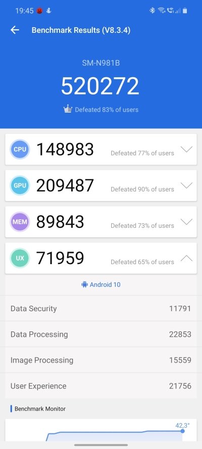 Jeśli chodzi o popularne benchmarki, Galaxy Note 20 uzyskał następujące wyniki: