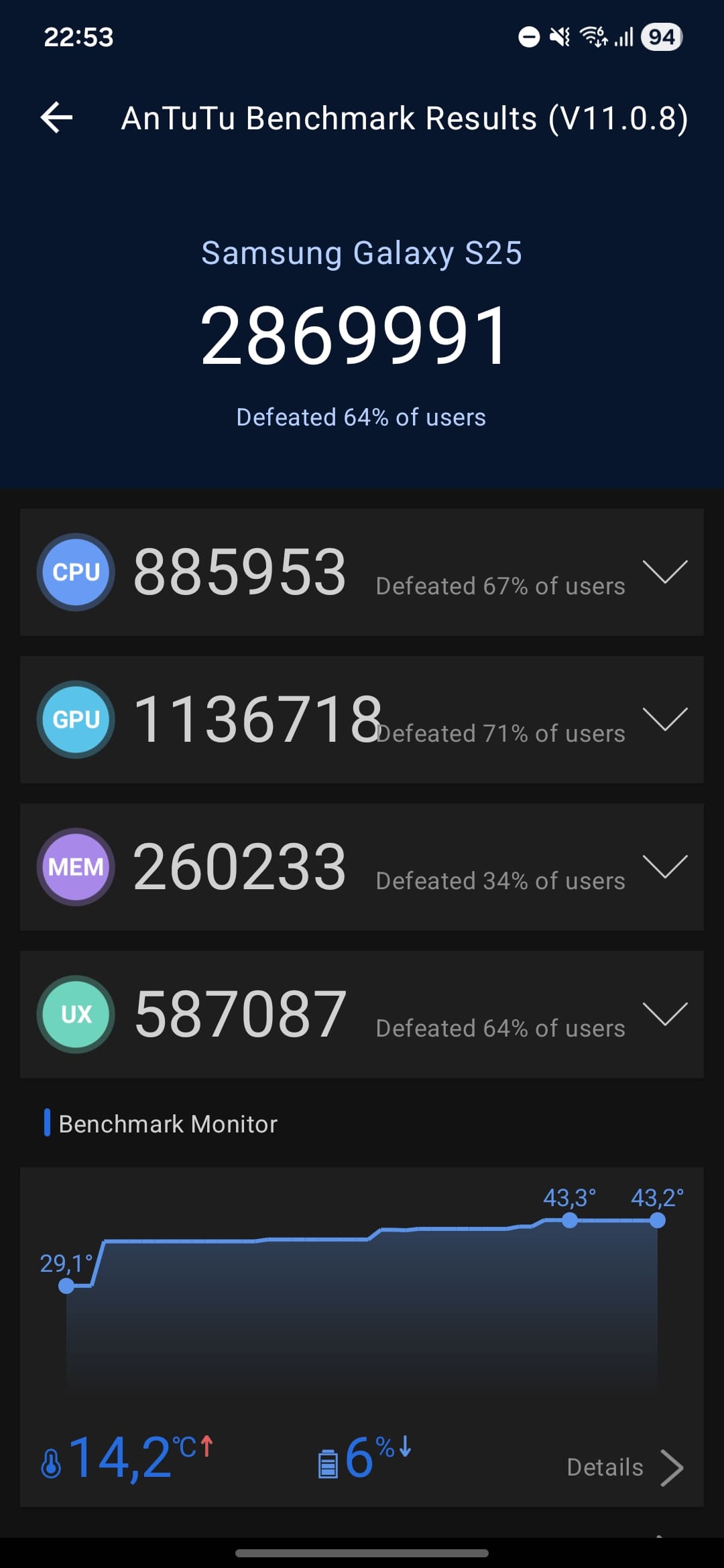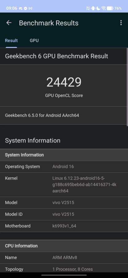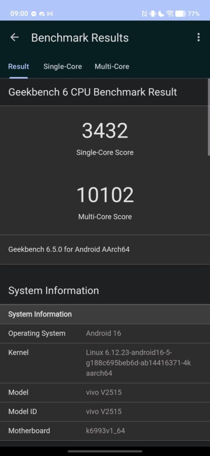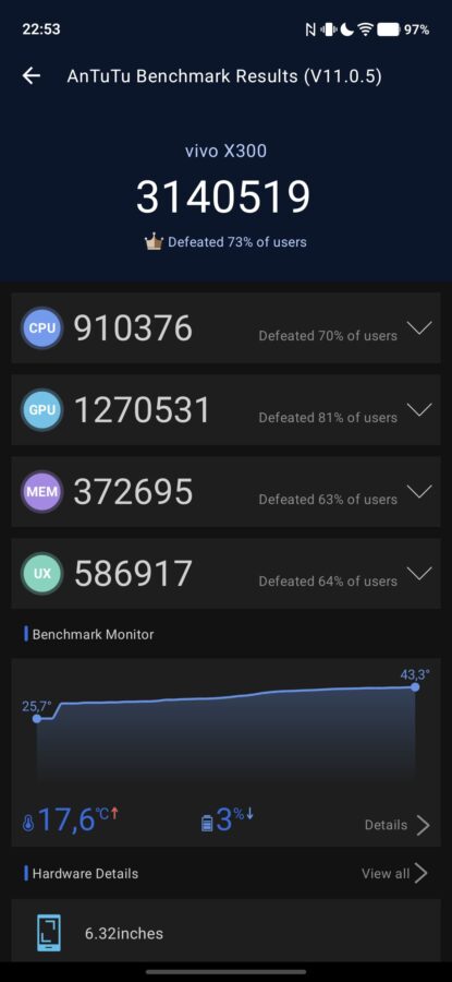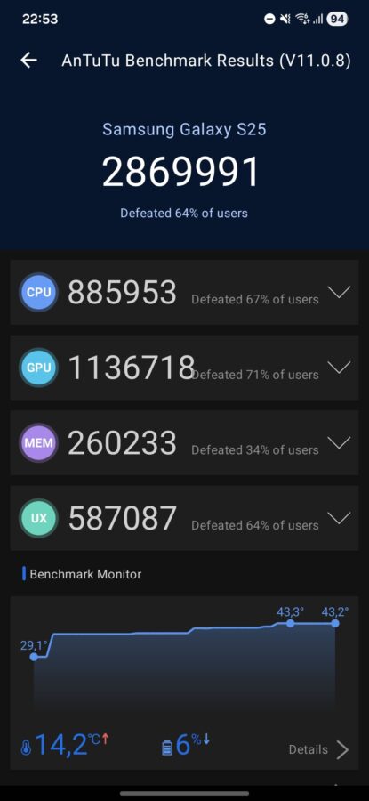Wydajnościowo – podczas typowego, codziennego użytkowania – oba modele są podobne. MediaTek Dimensity 9500 staje do walki ze Snapdragonem 8 Elite bez kompleksów, bijąc go w testach syntetycznych, aczkolwiek trzeba mieć też świadomość, że X300 ma 16 GB RAM, a Galaxy S25, niezależnie od pamięci wewnętrznej, 12 GB RAM.