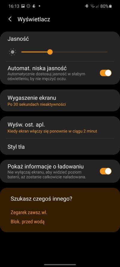 Galaxy Watch 3 może działać w dwóch trybach – z wyłączonym ekranem, gdy nie jest używany (wystarczy podnieść nadgarstek, żeby wybudzić ekran) i z ciągle włączonym ekranem, kiedy to stale wyświetlana jest tarcza zegarka, aczkolwiek przygaszona względem standardowej jasności – podniesienie nadgarstka, przekręcenie pierścienia lub wciśnięcie któregoś przycisku wybudza go. Fajne jest to, że jeśli w tym trybie mamy jakieś oczekujące powiadomienie, to pomarańczowa kropka jest jaśniejsza niż tarcza, dzięki czemu nie sposób je pominąć.