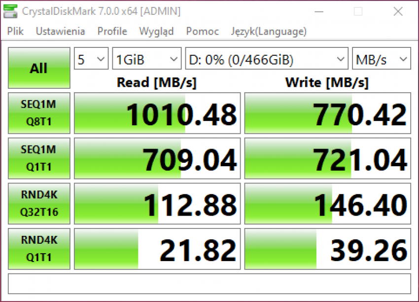 W celu wykonania pełnej analizy pracy urządzenia przeprowadziłem także testy na komputerze stacjonarnym z systemem Windows 10, używając programu CrystalDiskMark.