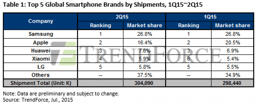 Przez te trzy miesiące sprzedano łącznie 304 miliony smartfonów, co stanowi poprawę o 1,9 procenta w stosunku do poprzedniego kwartału. Pierwszą pozycję zdołał utrzymać Samsung. Koreańczycy dalej posiadają żółtą koszulkę lidera z rezultatem 26,8 %, czyli sytuacja pozostaje stabilna. Cóż, sprzedaż flagowych Galaxy S6 jest świetna, chociaż producent oczekiwał znacznie większego zainteresowania swoimi high-endami. Zobaczymy, jak będą się sprzedawać nowe Note 5 i S6 Edge Plus.