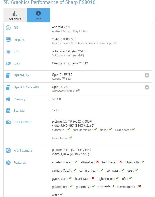 Ale po kolei. Jak już powiedziałem, specyfikacja Sharpa FS8016 nie jest dla nas tajemnicą. Lecz GFXBench, oprócz tego, że ją potwierdził, to przy okazji także ją uzupełnił. Teraz wiemy więc, że smartfon wyposażono w 5,5-calowy wyświetlacz o dość „niecodziennej” rozdzielczości 2040×1080 pikseli, ośmiordzeniowy (8 x Kryo 260; 14 nm) procesor Qualcomm Snapdragon 660 z układem graficznym Adreno 512, 4 GB RAM, 64 GB pamięci wewnętrznej, 12 Mpix aparat główny z możliwością nagrywania wideo w jakości 4K, kamerkę 8 Mpix na przodzie, żyroskop oraz NFC. Całość działać będzie pod kontrolą systemu Android 7.1.1 Nougat.