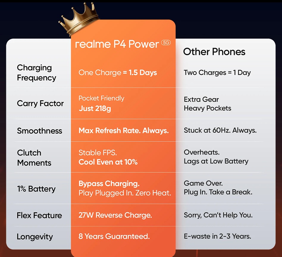 Na przywoływanej stronie opublikowano również absurdalną tabelę, w której smartfon Realme P4 Power 5G jest porównywany z „innymi telefonami”. Widnieje w niej na przykład informacja, że… trzeba go będzie ładować co 1,5 dnia, podczas gdy w przypadku „innych telefonów” konieczne jest podłączanie do ładowarki dwa razy dziennie.