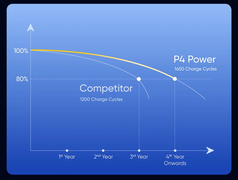 Jeżeli podzielimy tę liczbę (1650) przez liczbę lat (4) i następnie przez liczbę dni w roku (365), okaże się, że wykres zakłada ładowanie prawie codziennie. Pocieszeniem w tej sytuacji może być obsługa ładowania o mocy 80 W i deklaracja, że pięciominutowe ładowanie zapewni zapas energii na pół dnia.