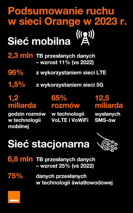 W 2023 roku w sieci mobilnej klienci Orange przetransferowali 2047285 TB danych, o 11% więcej niż w 2022 roku. Zdecydowaną większość, bo aż 96%, przesłano w technologii LTE, natomiast marne 1,5% z wykorzystaniem 5G. Za pozostałą cześć odpowiadają 3G i 2G.