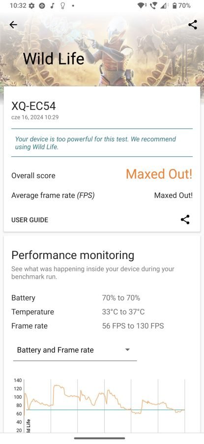 W kwestii stabilności – smartfon osiągnął wynik na poziomie 45% w Wild Life, natomiast w Solar Bay po dwudziestu pętlach telefon zachował stabilność na poziomie 66%. Nie są to złe wyniki, choć zawsze można oczekiwać czegoś lepszego.