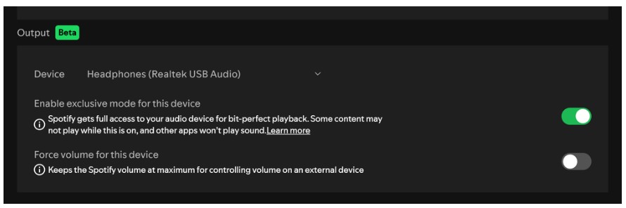 Aby włączyć nowy tryb należy podłączyć urządzenie audio do komputera, a następnie uruchomić aplikację Spotify i przejść do sekcji Ustawienia. Na liście należy odnaleźć opcję Odtwarzanie i w obszarze Wyjście wybrać urządzenie audio (w rozwijanym menu). Ostatnim krokiem jest już włączenie Trybu Ekskluzywnego.