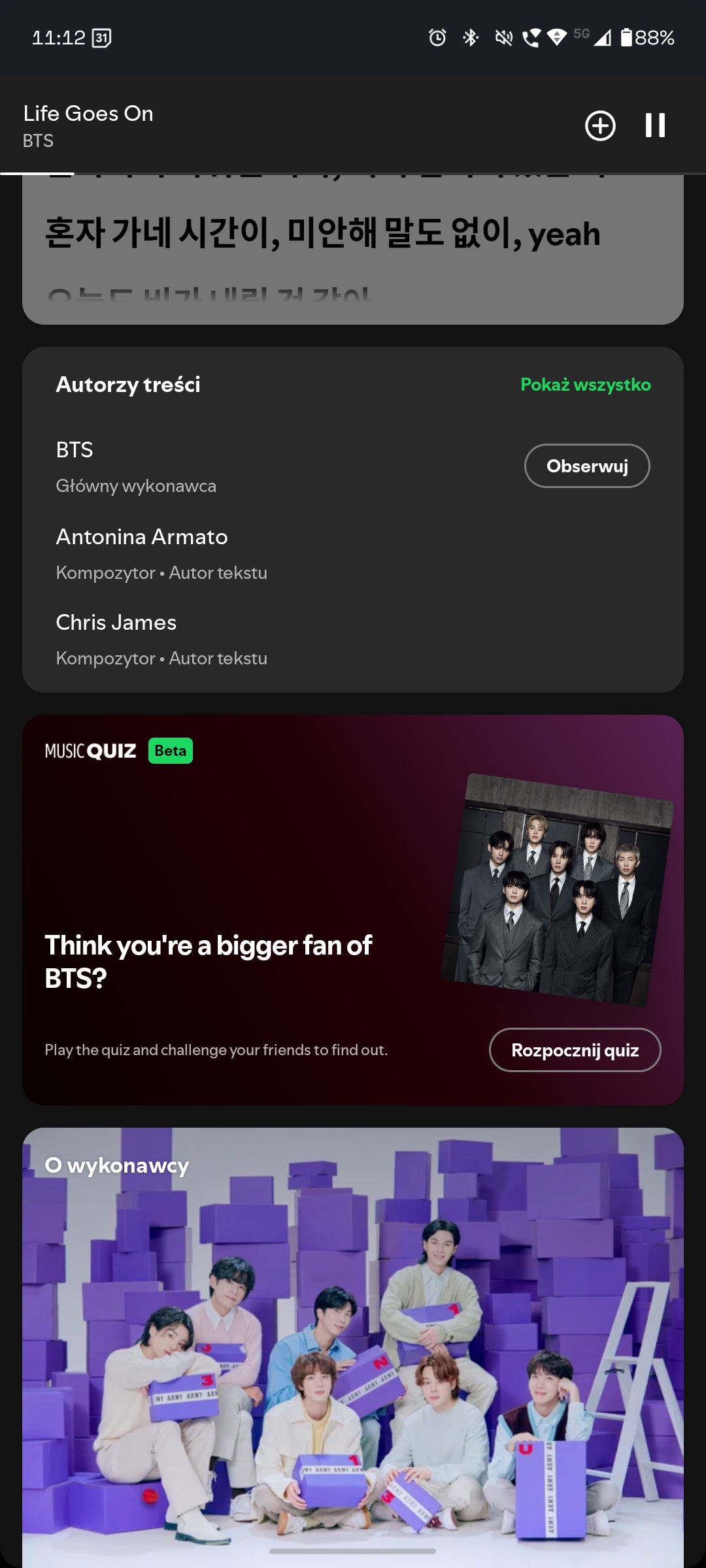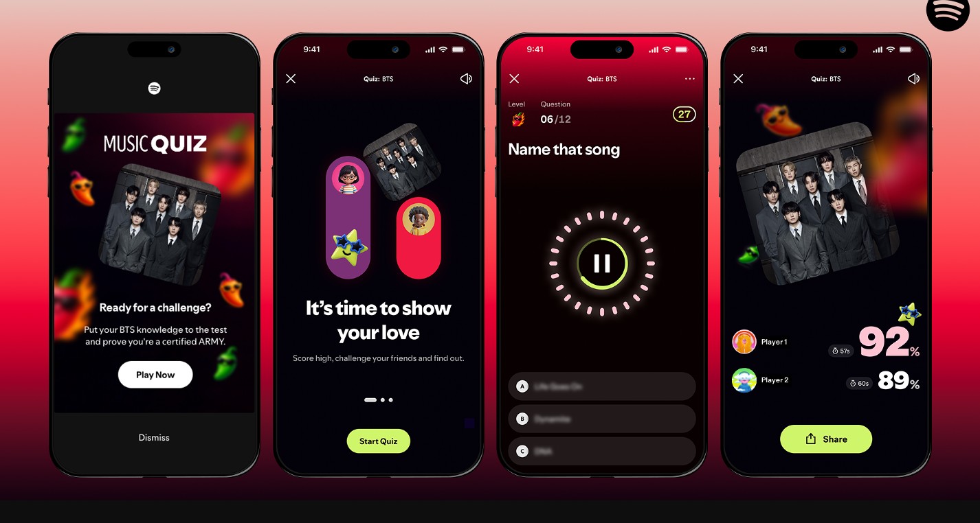 Spotify poinformowało również, że firma nawiązała współpracę z gwiazdą popu BTS. Owocem tych prac jest udostępnienie quizu muzycznego ARMY. Użytkownicy z całego świata oraz fani BTS mogą sprawdzić swoją wiedzę na temat zespołu.