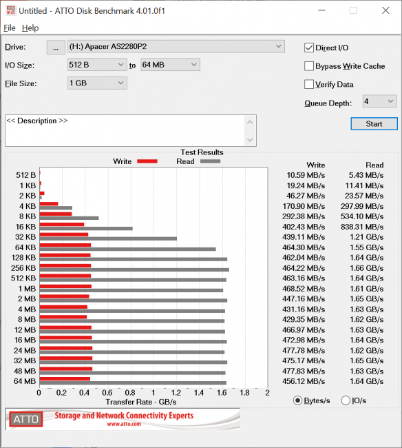 ATTO Disk Benchmark także pokazuje maksymalną prędkość odczytu powyżej deklarowanej przez producenta. Wydajność zapisów z kolei jest niższa – i chyba ten pomiar lepiej ją charakteryzuje niż CDM.