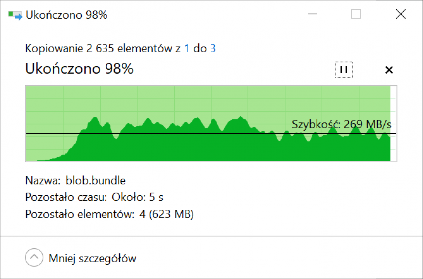 Pojedyncze pliki kopiowały się w czasie identycznym lub nieznacznie dłuższym. Średnio było to około 300 MiB/s, co nie jest wynikiem powalającym na kolana, ale w budżetowej konstrukcji można je uznać za akceptowalne, szczególnie, że wyniki te na pewno nie biorą już pod uwagę cache.