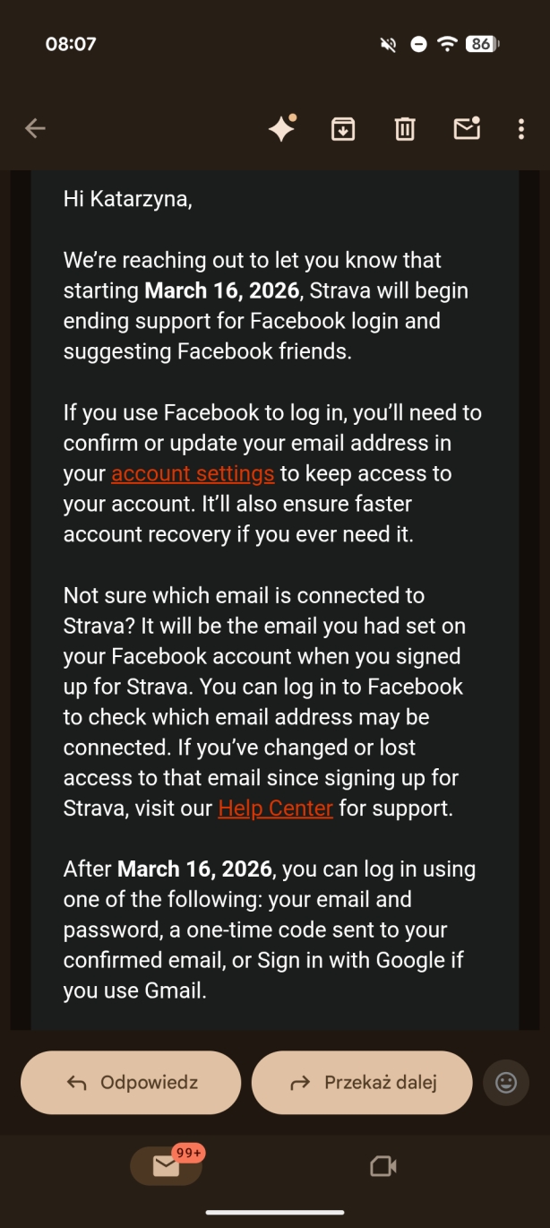 Warto też wspomnieć, że do 16 marca nadal można logować się przez Facebooka. Takie logowanie zapewnia dostęp do opcji potwierdzenia lub aktualizacji adresu e-mail powiązanego z kontem, co może być przydatne ze względu na nadchodzące zmiany.