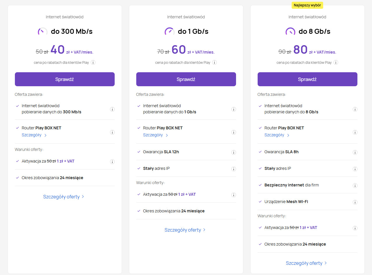 Nową ofertę internetu światłowodowego w Play tworzą trzy plany, których ceny przedstawiają się następująco: