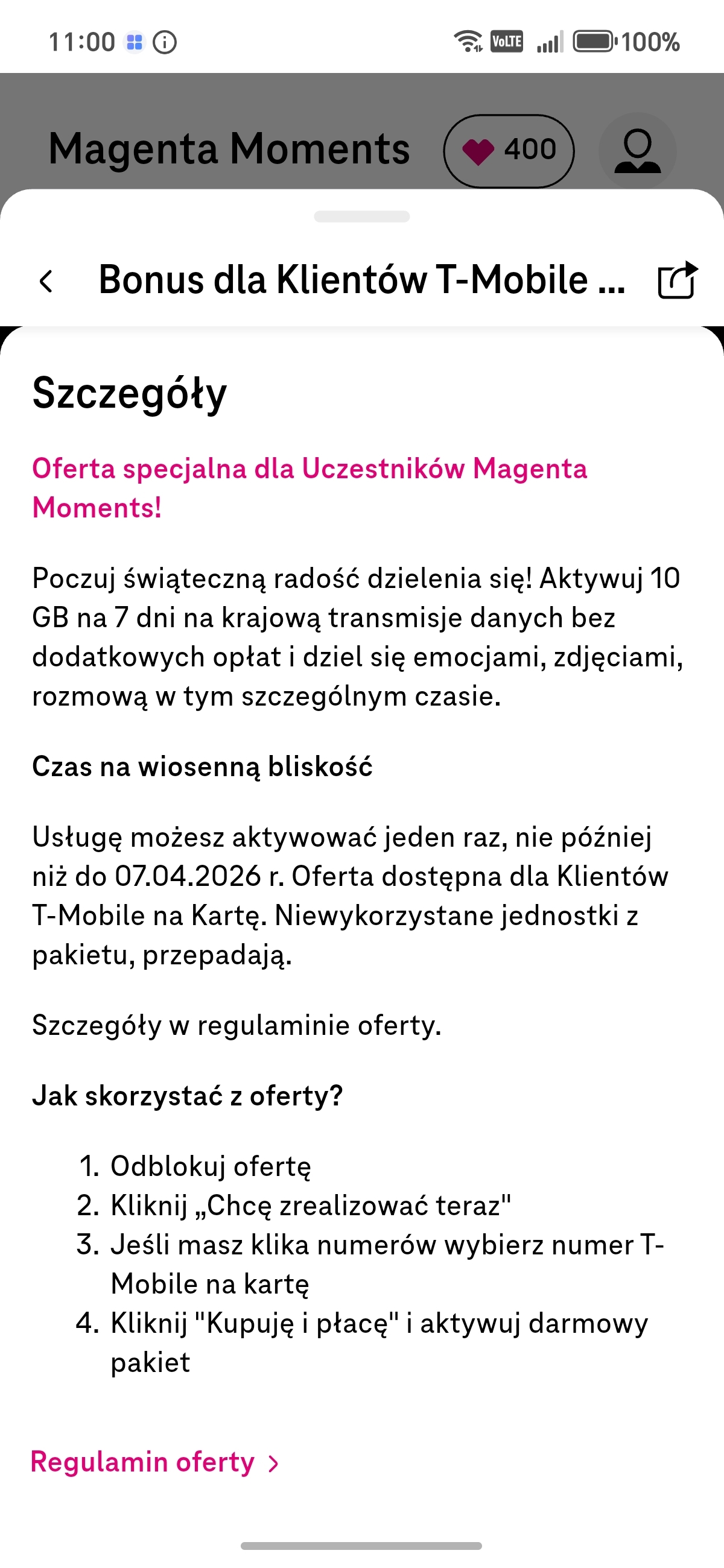 Oferta została skierowana do użytkowników oferty MIX oraz numerów na kartę w T-Mobile, a także klientów Heyah na kartę. Promocja obowiązuje od 1 do 7 kwietnia 2026 roku. Jednym z podstawowych warunków, aby skorzystać z tej okazji, jest uczestnictwo w programie lojalnościowym Magenta Moments, dostępnym w aplikacji Mój T-Mobile. Darmowy internet jest dostępny jednorazowo, a gigabajty niewykorzystane w ciągu 7 dni gigabajty wygasają.