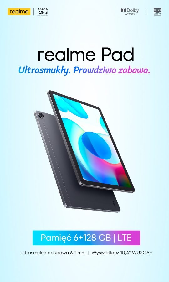 Ku przypomnieniu, relame Pad jest tabletem z aluminiową obudową o grubości 6,9 mm, a zatem jest jednym z najcieńszych na rynku. Oprócz tego urządzenie może pochwalić się ekranem IPS o przekątnej 10,4 cala i rozdzielczości 2000 x 1200 pikseli oraz procesorem MediaTek Helio G80. Całość zasila bateria 7100 mAh, wspierająca szybkie ładowanie 18 W.