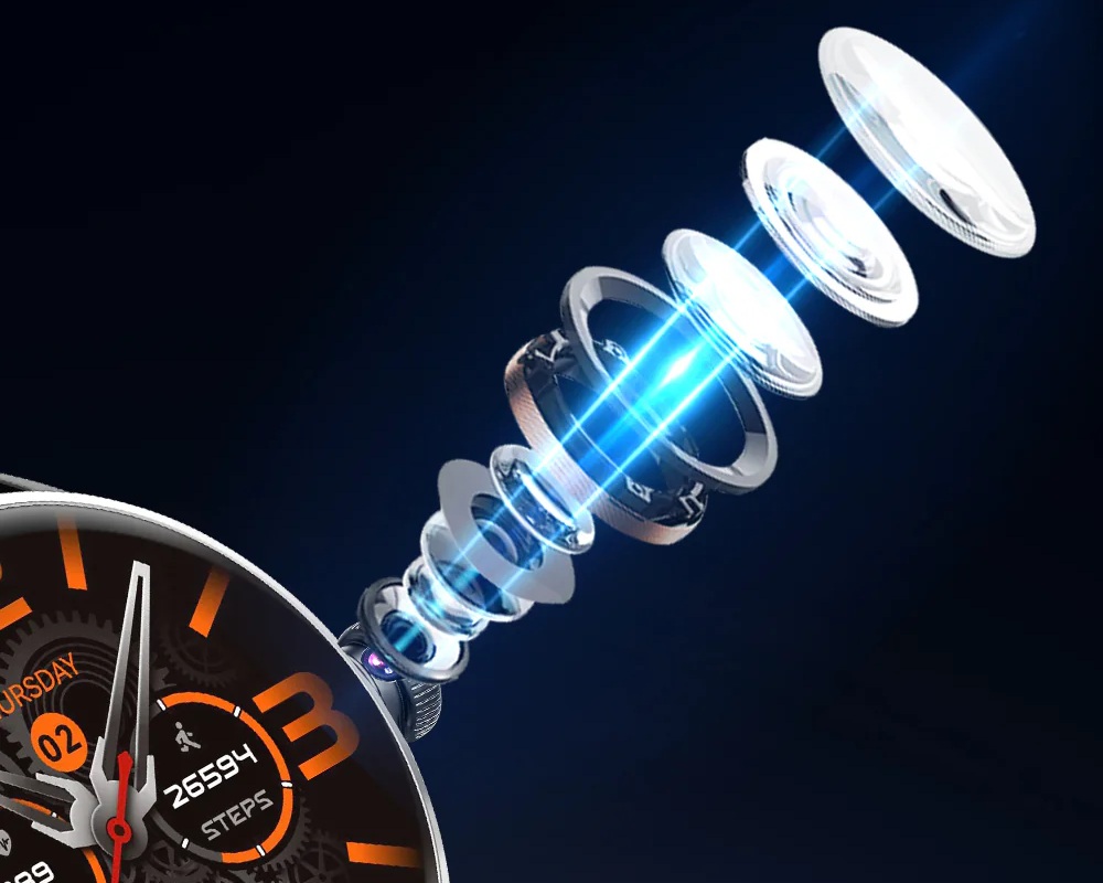 Na pierwszy rzut oka Rogbid Model R3 wygląda jak „przeciętny” smartwatch. Ma okrągły wyświetlacz – AMOLED o średnicy 1,65 cala i wysokiej rozdzielczości 480×480 pikseli – pokryty szkłem Panda Glass i umieszczony w obudowie o średnicy 46 mm. Jest to zatem zegarek na dużą, męską rękę.