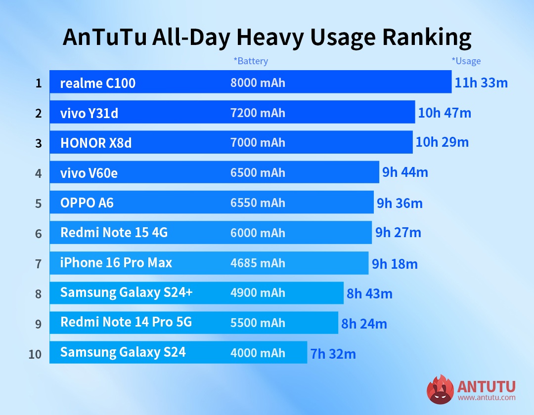 AnTuTu, które regularnie publikuje ranking najwydajniejszych smartfonów z Androidem (i nie tylko), tym razem wzięło na warsztat akumulatory. Procedura testowa była bardzo wymagająca, ale miała odzwierciedlać typowe codzienne wzorce korzystania z urządzeń przez uczniów.