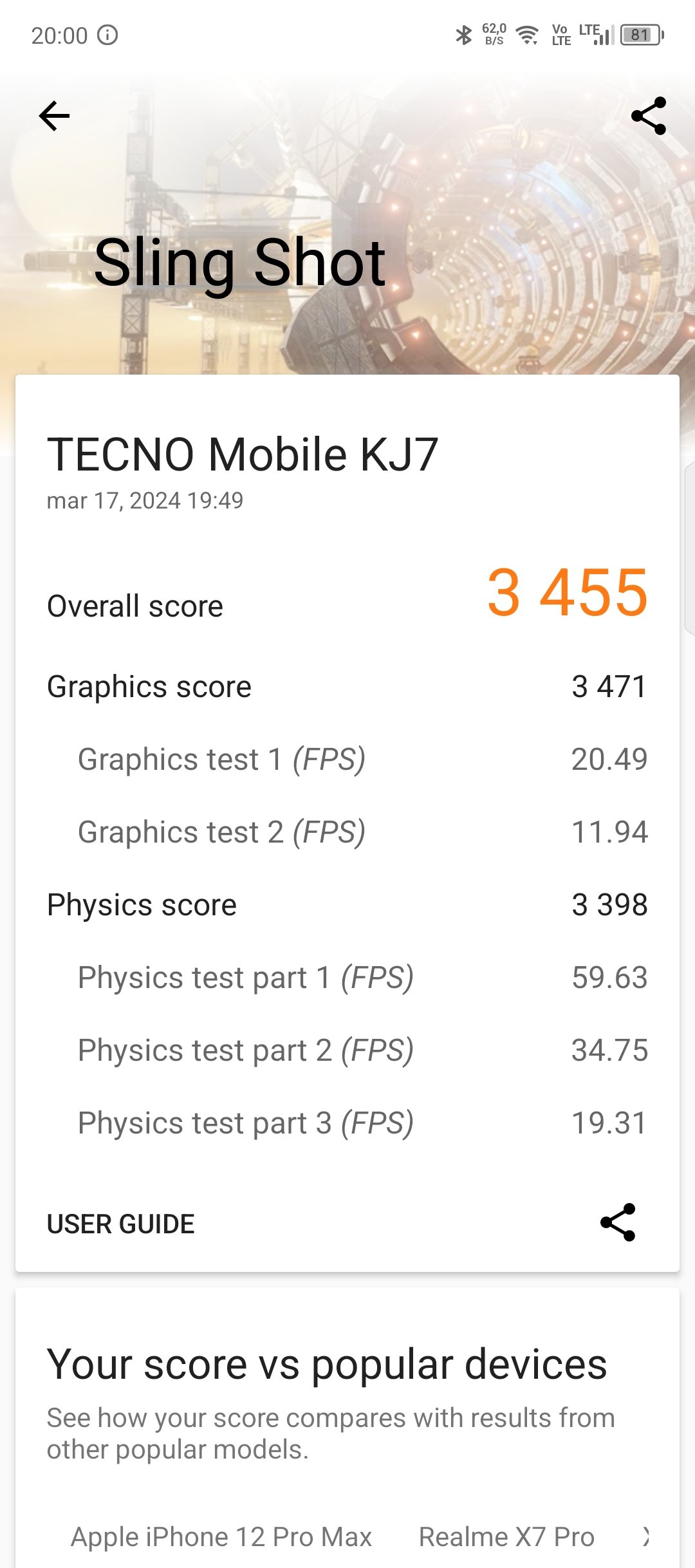 Choć producent nie wspomina o typie używanej pamięci wewnętrznej, to testy sugerują, że Tecno Spark 20 Pro+ wykorzystuje kości w standardzie UFS 3.1. W testach CPDT smartfon wypadł następująco (najwyższy odnotowany wynik):
